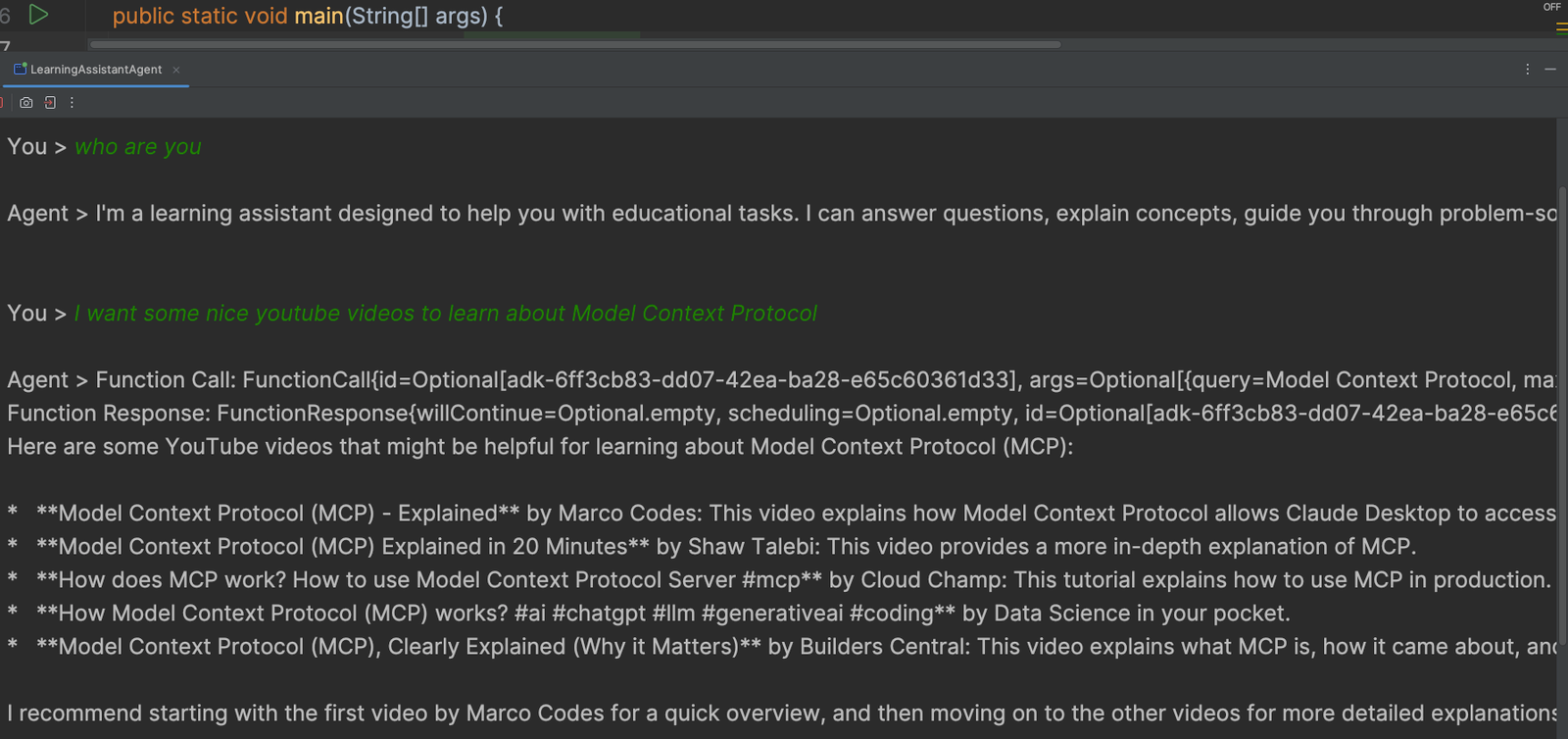 To run the agent, we need to create a main method that initializes the agent and starts a session. You can add it to the LearningAssistantAgent class or create a separate class for the main method.